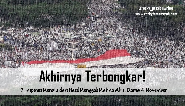 Jika 4 November 2016 hanya mampu menghasilkan opini, itu hal biasa. Tapi bagaimana jika bisa menghasilkan inspirasi dan tips menulis? Sebagai Passion Writer, mencari inspirasi menulis dari setiap kejadian adalah keharusan. Dan berikut adalah inspirasi menulis yang saya gali dari Aksi Damai yang bermartabat pada 4 November 2016.