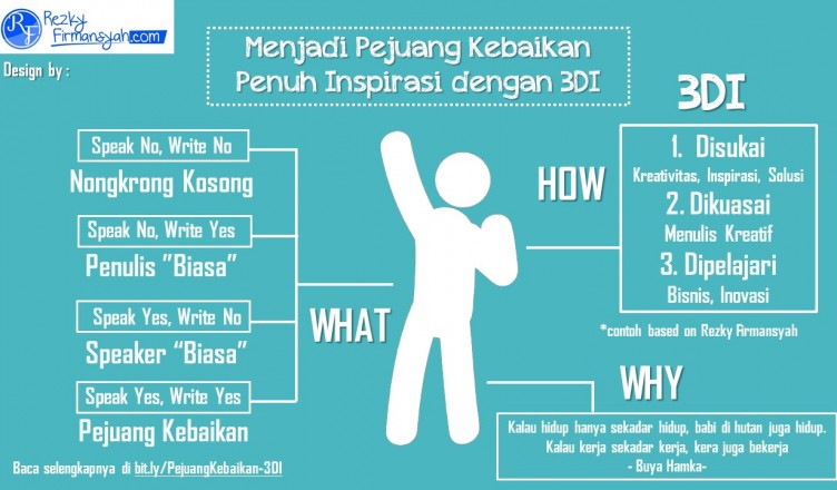 Mari berbicara solusi dan inspirasi. Sebagai Passion Writer, saya akan hadirkan solusi. Gunakan rumus 3DI. Menemukan Inspirasi dengan 3DI. Menjadi Pejuang Kebaikan penuh inspirasi dengan rumus 3DI. Apa saja?