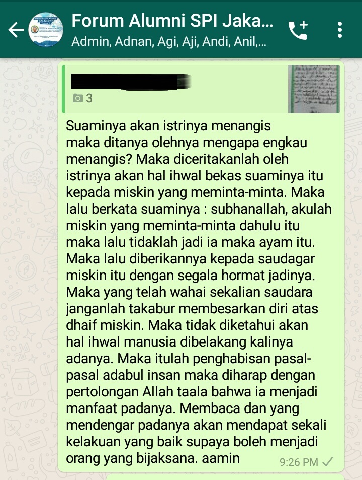 Apa yang membuat saya tertarik? Karena hadiah buku? Nggak sih. Malah awalnya saya tidak tertarik sama sekali karena dikirim 3 gambar dengan tulisan ‘aneh’ yang harus ditransliterasikan. Saya kira itu tulisan Arab gundul seperti halnya kitab kuning. Saya yang tidak pernah mondok di pesantren wajar saja tidak bisa. Tapi entah kenapa ada yang menarik saya untuk membaca baik-baik gambar yang dikirim ke grup. Ternyata itu bukan tulisan Arab gundul, tapi Arab Melayu. Saya baca dong perlahan. Alhamdulilah masih bisa.