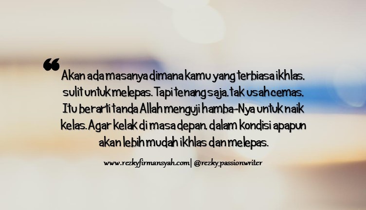 “Akan ada masanya dimana kamu yang terbiasa ikhlas, sulit untuk melepas. Tapi tenang saja, tak usah cemas, Itu berarti tanda Allah menguji hamba-Nya untuk naik kelas. Agar kelak di masa depan, dalam kondisi apapun akan lebih mudah ikhlas dan melepas.”